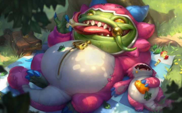 顾名念念义,塔姆穿上了《云顶之弈》主题的COSPLAY玩偶服,形成了胖胖龙的神色,跳摆动作亦然云顶胖胖龙的跳舞。塔姆自己等于恶魔属性,即使穿上玩偶服,也无法像胖胖龙那样可儿。但恰是这种画虎类狗反类狗的反差感,赋予了这款皮肤特有的魔力。他的胸前还有一把金铲铲。