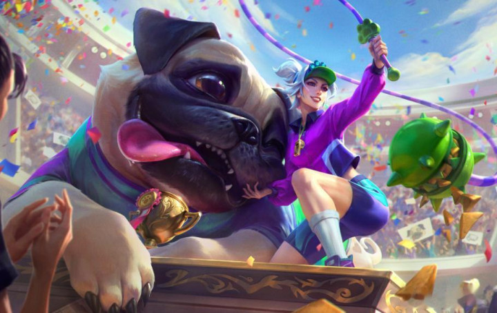 瑟庄妮此次不骑猪了,改骑狗——况且骑的如故克格莫同款的哈巴犬。瑟庄妮的造型芳华靓丽,像是在插足骑行大赛,她的脚色形成了驯兽师。这款皮肤最搞笑的是好意思术图:小狗竟然抱着冠军奖杯,况且奖杯上有犬爪的图案,毕竟他们是在插足斗犬大赛。