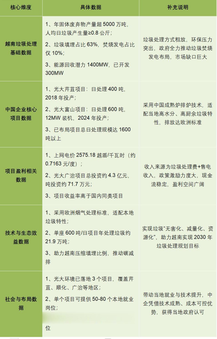 中国垃圾发电企业在越南的布局,终端了经济效益、生态效益与社会效益的三重共赢,以下通过表格直不雅呈现中枢数据,联结翰墨解读,明晰展现行业发展近况与价值孝顺,所特殊据均来自巨擘行业报谈与越南官方裸露,确保精确可靠。