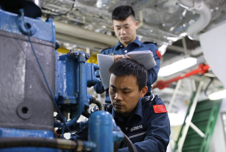 无论白日暮夜,机舱里时刻齐能看到两名舰员结对巡检的身影。一朝发现故障险情,几位技巧过硬的“淳厚傅”就要带着用具在狭小的舱室里衔接奋战抢修,保证树立安全、健康最先,常常一干即是几个小时,群众周身湿透,满脸油污。