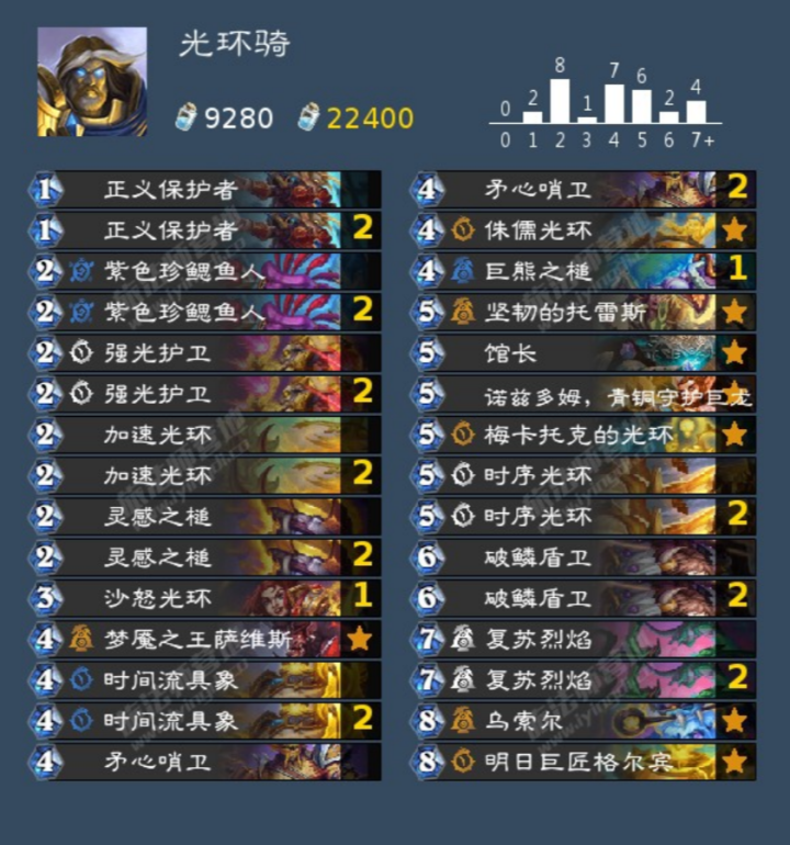 光环骑是上个版块就很火热的卡组了,天然退环境损失了一些组件,但交融新加入的回合末端体系让光环骑依然有可以的强度,博亚体育app况兼嗅觉光环骑打灌输德和铺场德相对莫得那么弱势,咫尺的光环骑粗拙是前期靠紫色珍腮鱼东说念主告成把加快光环从牌库里拽出来,然后靠着伪跳费提前拍高费奴隶和光环。尤其是咫尺圣骑士前期通常用度比小德还高,又有各式解场和嘲讽,比及中期一波超张开,小德就打不外了。清风还遭逢过一个矛心哨卫回合末端给了个裂变法术,拍下强硬的托雷斯后灌输德频率不够解不掉,下回合裂变法术一拍告成更看不解白了。不外咫尺圣骑士的热度并不高,况兼大部分东说念主在玩以回合末端为主要中枢的卡组,嗅觉强度是不如以光环为中枢的,不知说念后续跟着环境变化圣骑士的全体胜率会不会有所变化。