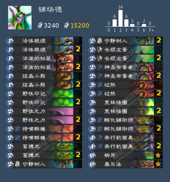 如果说灌输德是铺得又快又大,那铺场德等于铺得又快又多,就像上头说的,有好多解牌都退环境了,既毋庸防乱斗又毋庸防邪爆,猛猛开铺就完事了,况兼德鲁伊的裂变法术还可以给奴隶贴树东说念主一火语,即使被解了还可以无间赖场,再加上各式buff时候,进犯性要比灌输德强多了,只须前期不是超越卡手,很容易告成把灌输德推死。铺场德卡组里带了两张橙卡,不外都属于镌脾琢肾的类型,大部分时辰里并不需要他们脱手就能赢,但清风照实靠柳牙翻盘了一两把,如果尘不是很病笃的话嗅觉照旧值得合一张的。咫尺HSReplay上大数据统计铺场德最劣对局是内战,也等于说基本上打通盘卡组都是上风……