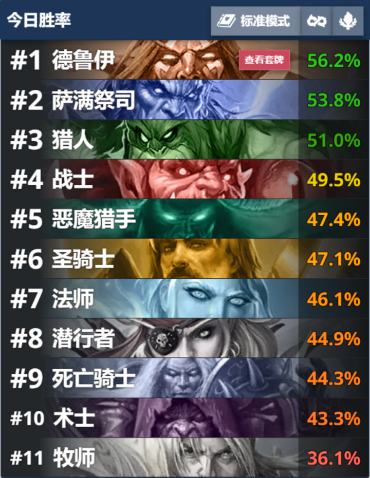 最初来望望新版块首日的十一工作胜率榜,一整天地来后,全体胜率还能跳跃50%的竟然只剩下三个工作了。榜首的是德鲁伊大东说念主,灌输德和铺场德依然在天梯杀疯了,亏空之翼和督察巨龙加起来都打不外德鲁伊的树东说念主,排在德鲁伊背面的是萨满和猎东说念主,兆示萨算兆示体系里相对偏进犯的卡组,猎东说念主亦然快攻猎强于龙猎,至于战士和恶魔猎手,昨天胜率还能拼集跳跃50%,今天也没能守住了。而咫尺垫底的是牧师,依然启动发低烧了,毕竟之前牧师能打的套路都退环境了,倒数第三是亏空骑士,天然咫尺兆示DK有bug,但嗅觉就算没bug濒临咫尺的快攻环境也不彊,不外倒数第二的竟然造成了方士,嗅觉兆示蛋术照旧有点强度的,可能照旧打不太过快攻。