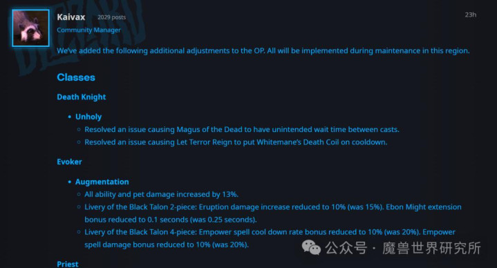 随后暴雪又发了一个,此次触及的主如果DK,唤魔师和暗牧,暗牧这个看着是数值大加强,实质上是缔造了一个良性BUG,此BUG此前有增伤,博亚体育app一增一减,是削还是加强不好评价,要等测试。