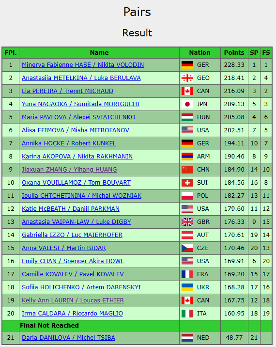 德国组合黑泽/沃洛丁凭借着总成绩228.33分首夺世锦赛冠军,这一成绩也比他们米兰冬奥会摘铜的分数擢升了近9分;