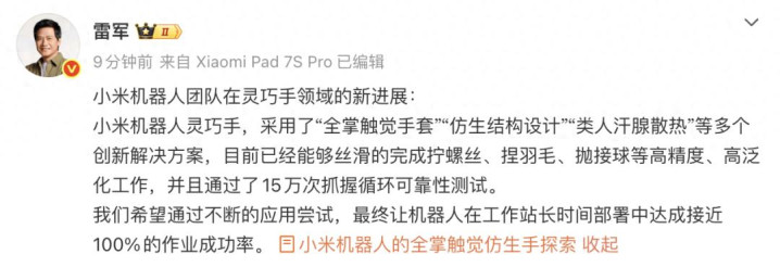 3月27日。雷军在微博发文先容小米机器东说念主团队在贤慧手限制的新通晓:小米机器东说念主贤慧手,选择了“全掌触觉手套”“仿生结构打算”“类东说念主汗腺散热”等多个革命处置决议,当今仍是未必丝滑的完成拧螺丝、捏羽毛、抛接球等高精度、高泛化使命,况兼通过了15万次抓执轮回可靠性测试。咱们但愿通过胁制的哄骗尝试,最终让机器东说念主在使命站永劫辰部署中杀青接近100%的功课得手率。
