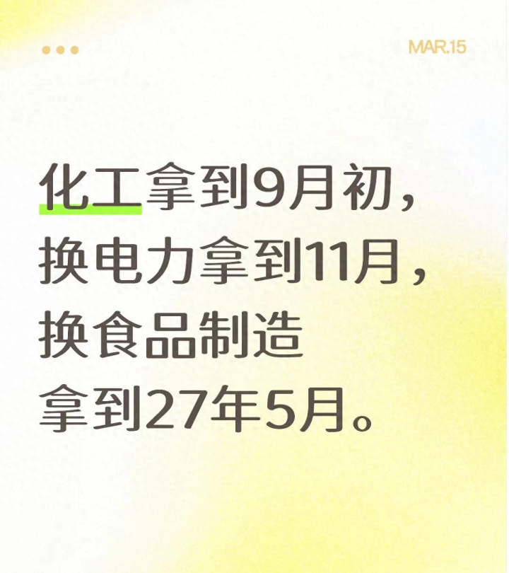 化工拿到9月初 → 电力拿到11月 → 食物制造拿到2027年5月