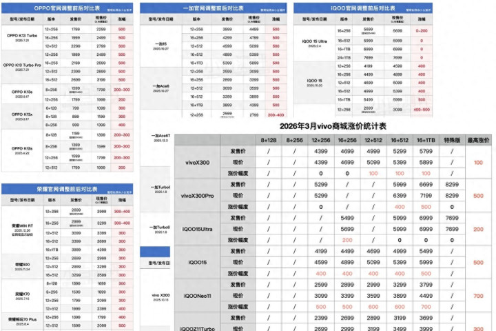 咫尺OPPO还是官宣加价,但官方莫得给出具体加价信息,从销售渠谈统计的数据来看,举座涨幅在200元到600元之间,不单是是旗舰机型,走量的OPPO K系列、A系列也还是有了不同进度的加价。