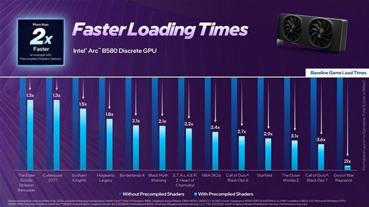 Intel声称,加入该时候后,锐炫B580、酷睿Ultra X9 388H(锐炫B390)的游戏载入速率平均进步2倍,酷睿Ultra 9 288V(锐炫140V)则平均进步3倍。