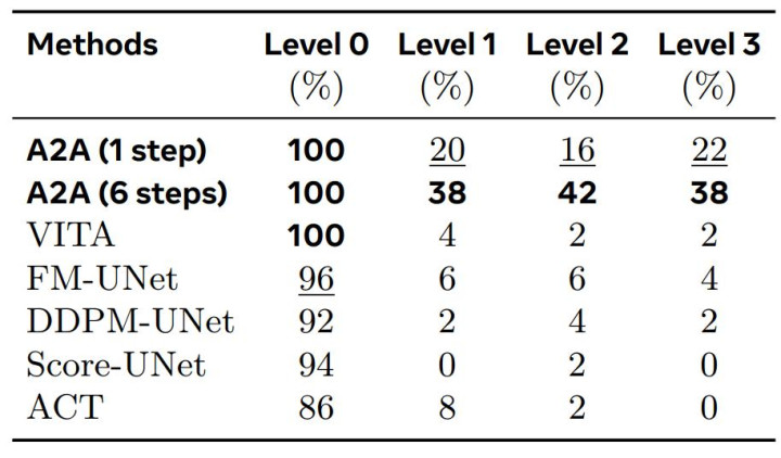 此外,推理速率方面,A2A 达成了亚毫秒级的极致推理速率,平均蔓延仅约 1ms,在单步推理口头下蔓延更是低至 0.56ms,比传统扩散计谋快 20 倍,比老例流匹配要道(10 步)快 5 倍。