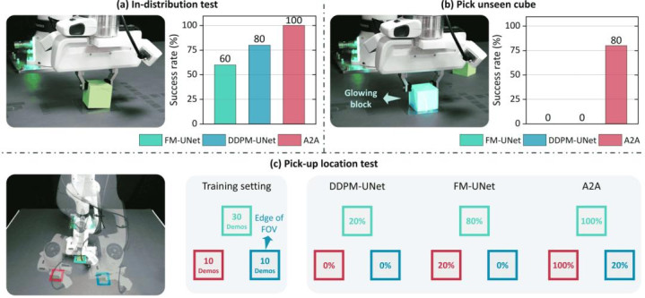 临了,A2A 极大擢升了视觉泛化性。举例,践诺中将握取木块换成从未见过的发光方块,传统扩散和流匹配计谋均会澈底失效,而 A2A 仍可保管 80% 的高见效用。