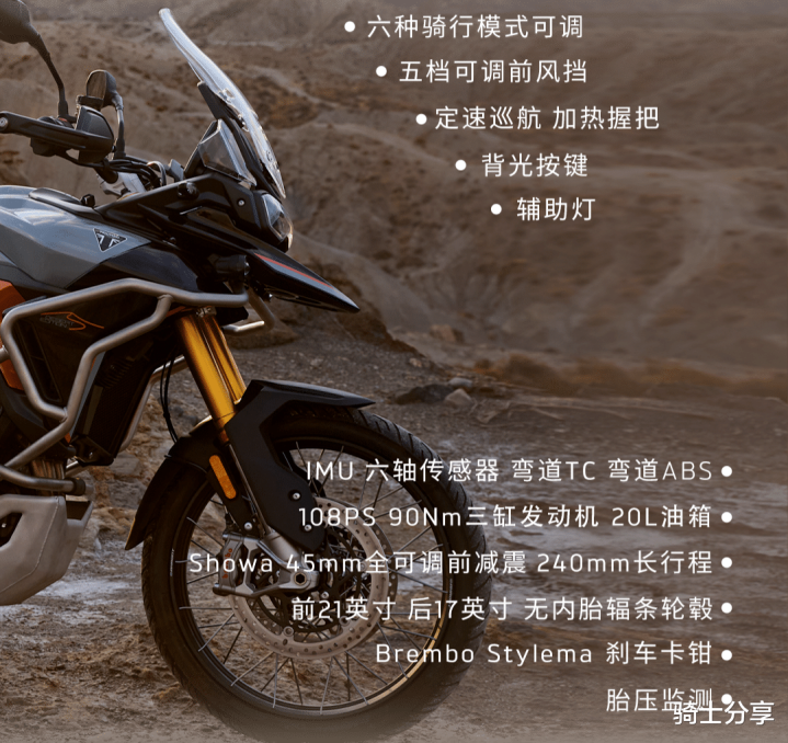 TIGER900 DESERT EDITION所搭载的是成功比拟擅长的直列三缸引擎,它的执行排量是888cc,压缩比13:1,看来需要吃细粮,波音体育官方网站其中最大马力来到了108匹,最大扭矩为90N·m,能源特色在戒备延展性的同期也有低转倾向,是以发力区间会比拟以前,不详稳健不同路况下的能源需求。