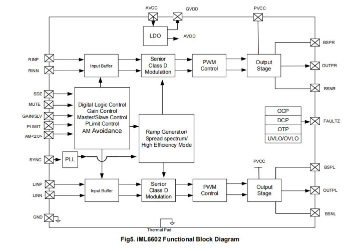 iML6602采选先进的Class-D放大时间,或者在无需普遍散热片的情况下,提供高达2×30W(8Ω BTL负载)或1×60W(4Ω PBTL负载)的输出功率,波音体育官方网站其高达94%的效果,提供高效的续航智商。同期,低至0.01%的总谐波失真加噪声(THD+N)确保音质的白皙与精细,不管是深千里的低音如故清翠的高音,齐能得到无缺呈现。