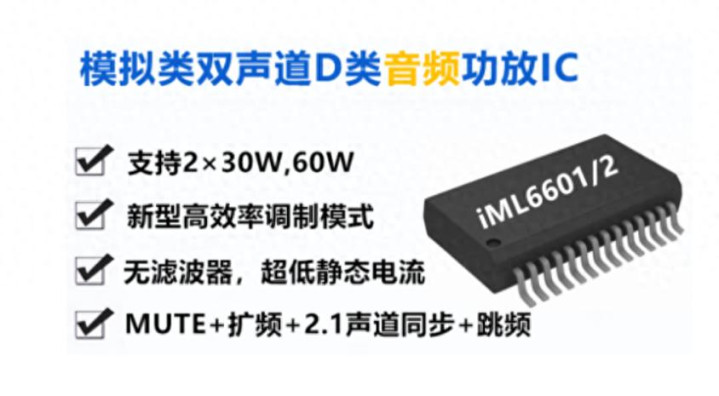 工采网代理的D类音频放大器-iML6602,这是款2×30W立体声/单通谈60W输出的高性能芯片,采选双通谈架构,可在24V供电THD+N=10%要求下,BTL模式能合手续提供2*30W/8Ω功率输出;PBTL(单通谈)模式或者合手续提供60W/4Ω功率输出,同期管脚能兼容替代TPA3118,无需修改电路想象,无需修改PCB布局。以94%超高效果、22mA超低静态电流及无滤波器想象,为蓝牙音箱、Soundbar、电视音响等配置提供“高保真+低功耗”的终极处置有打算。