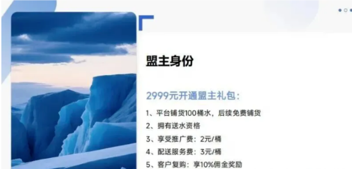 盟主:插足2999元,获100桶运行库存,精采小鸿沟配送。每桶赚3元配送费,每发展一新用户再赚2元。日送30桶即可月入3000+,模子明晰,适应轻创业。