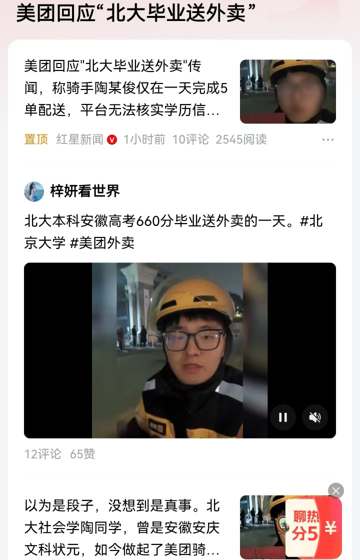 好意思团回复“北大毕业送外卖”,身份未核实,视频已下架,“起号”失败了?