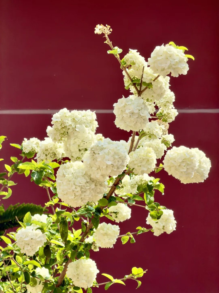 再往里走,红墙前的木绣球开了。一团一团的花,紧挨着那抹深红,说不出的温润。