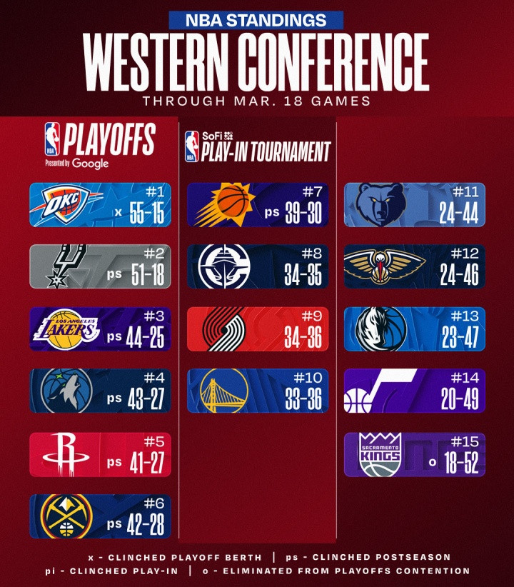 爵士不敌丛林狼被淘汰出季后赛及附加赛,掘金不敌灰熊,博亚体育app官方入口火箭不敌湖东谈主,丛林狼升至西部第四,火箭跌至西部第五,掘金跌至西部第六;